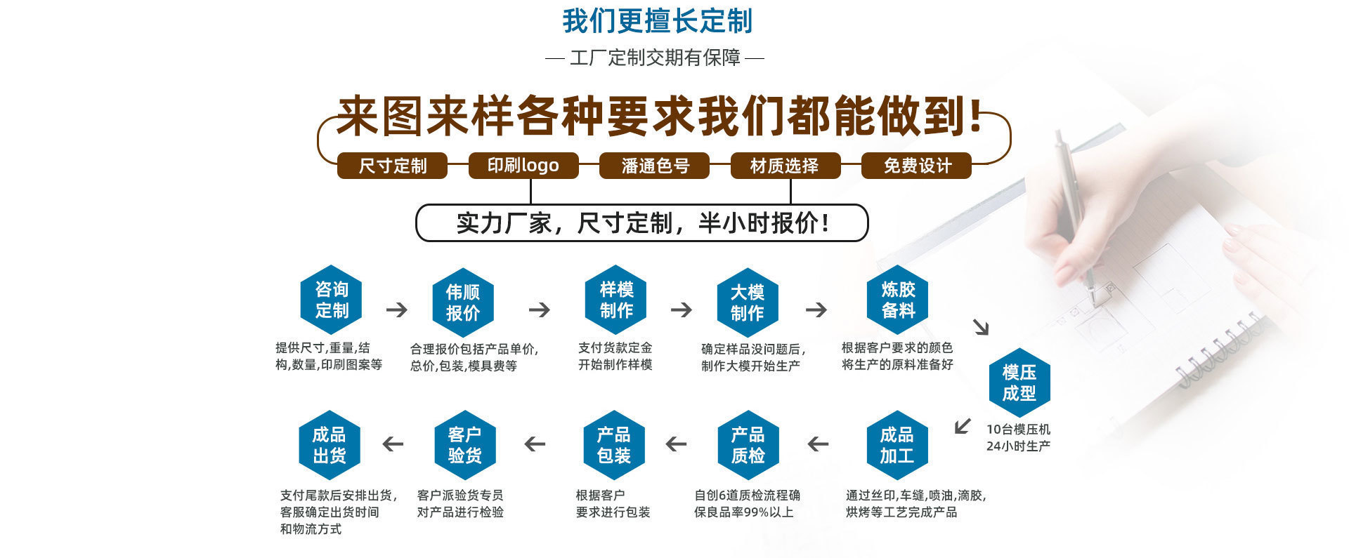 東莞偉順是一家自營生產、設計、研發、銷售為一體的民營東莞硅膠制品廠家,自有3000平米的生產基地,員工一百多人,月產硅膠制品20萬件,硅膠廚具生產廠家擁有完整的設備設施,20臺硅膠平板硫化機設備,硅膠套量產能力強大,質量保證。