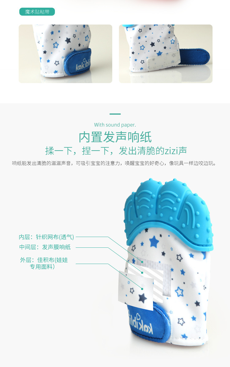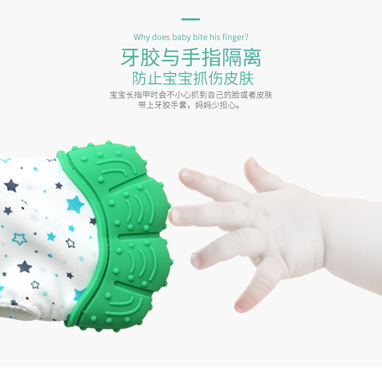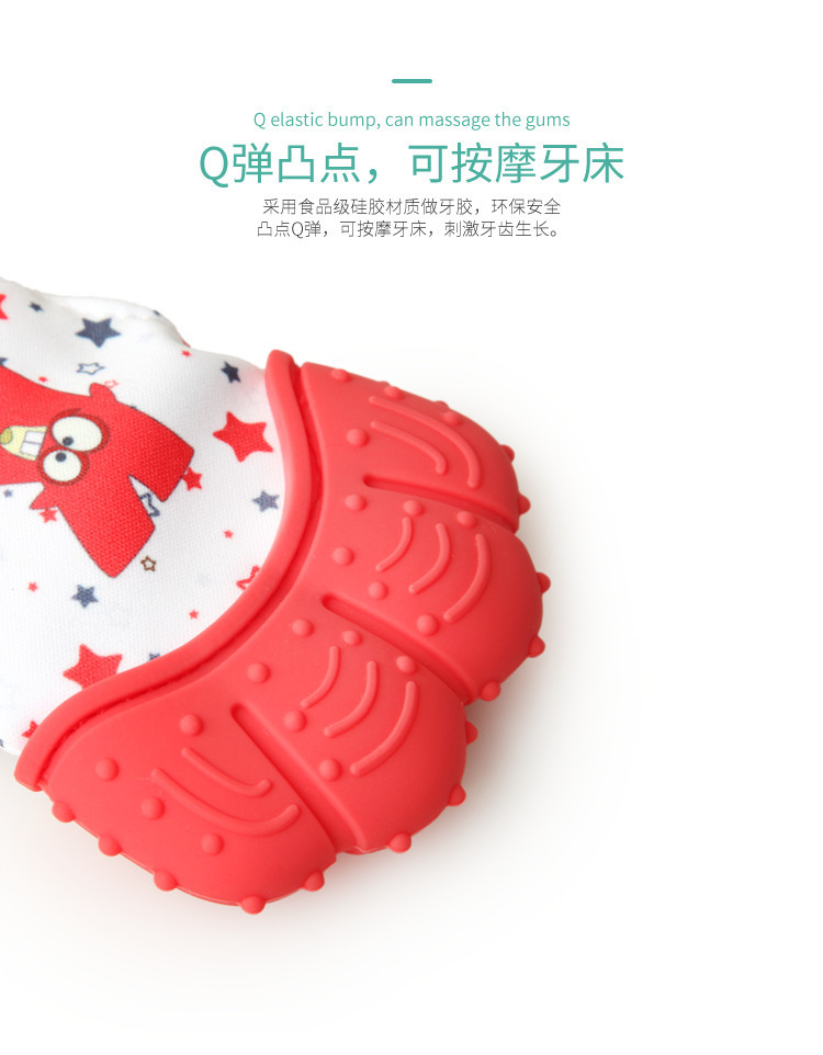 4、常規(guī)牙膠解決不了寶寶咬手指,磨牙手套能較好將手與牙齒隔開,寶寶啃咬時,既不會咬到手,還能按摩牙床。