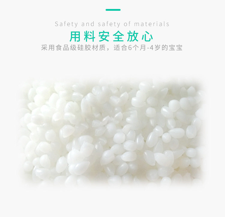 4、用料安全放心,采用食品級硅膠材質,適合6個月-4歲的寶寶