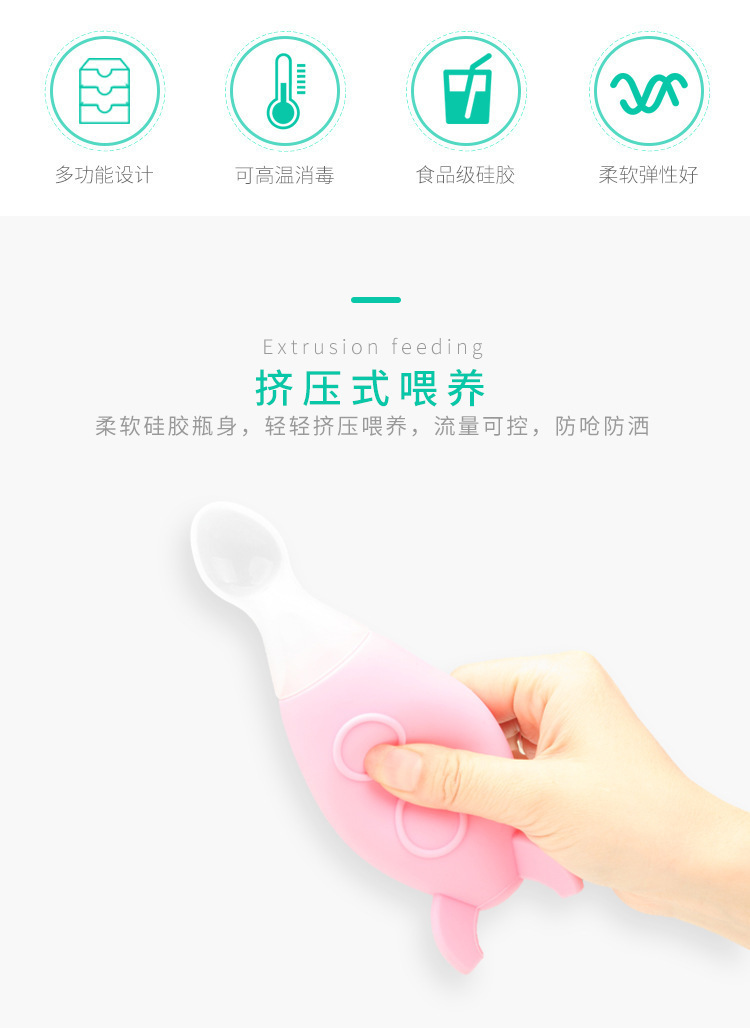 1、碗勺一體,輕松喂養,擠壓式設計,解放雙手,解決喂養煩惱